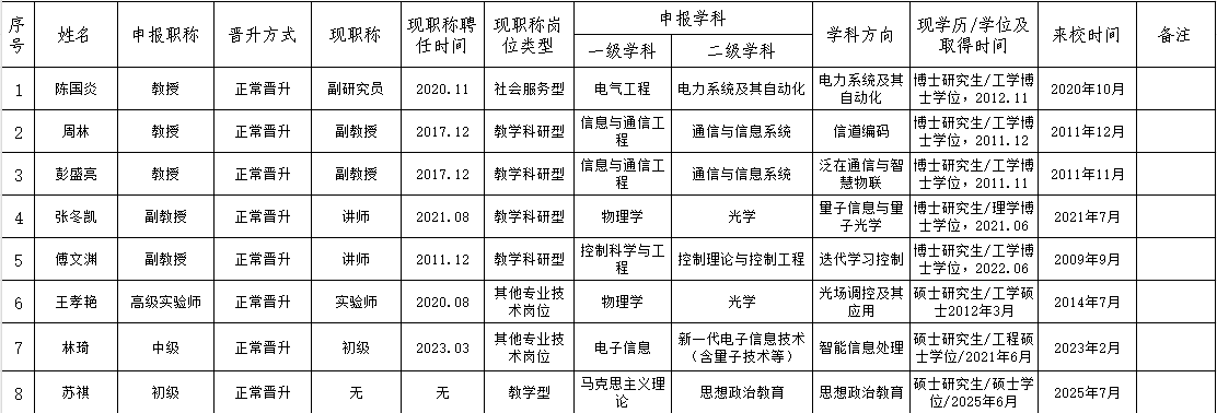 根据《关于2025年专业技术职务聘任工作安排的通知》(人事〔2025〕50号)的文件精神,经个人申报,教务处、科研院、研究生院、校团委等职能部门以及院考核推荐小组审核,同意推荐陈国炎等8位同志晋升专业技术职务,现予以公示: